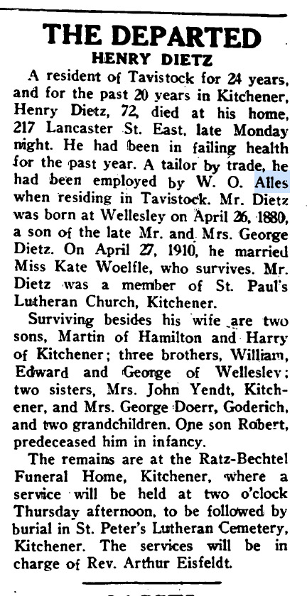 ParentsDietz, George & Quehl, AnnaBirthdate1880 Apr 26Deathdate1953 Apr 13SpouseWoelfle, KateVolumeDV1Page4Attachment