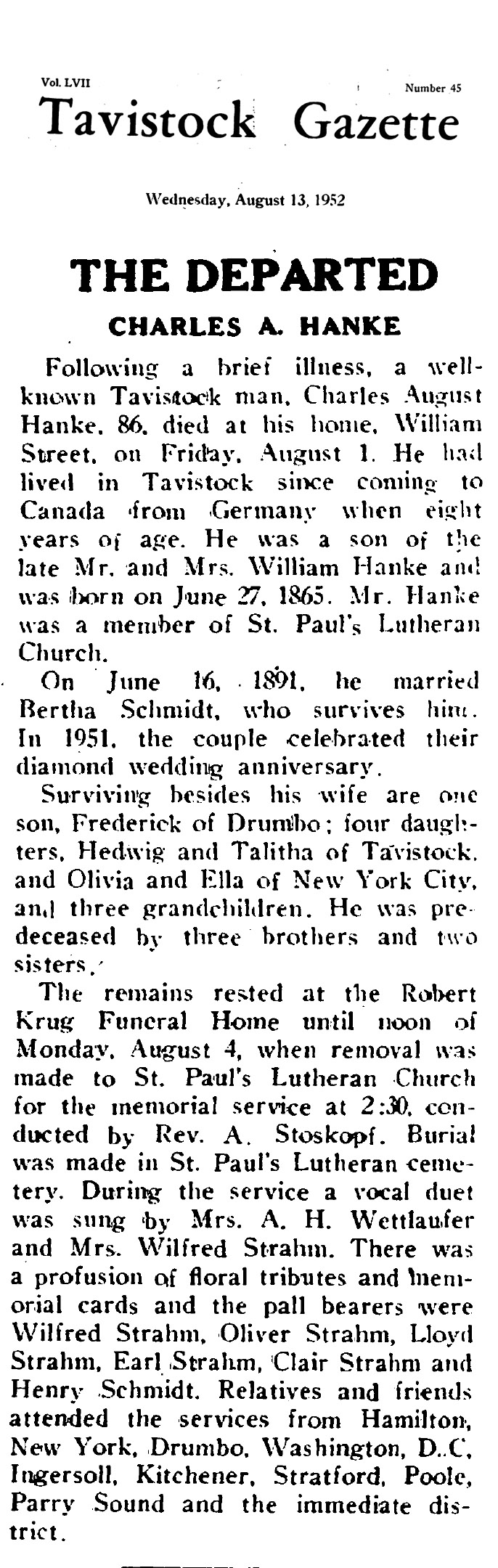 ParentsHanke, William & Fischer, WilhelminaBirthdate1865 June 27Deathdate1952 Aug 1SpouseSchmidt, BerthaVolumeHV4Page3Attachment