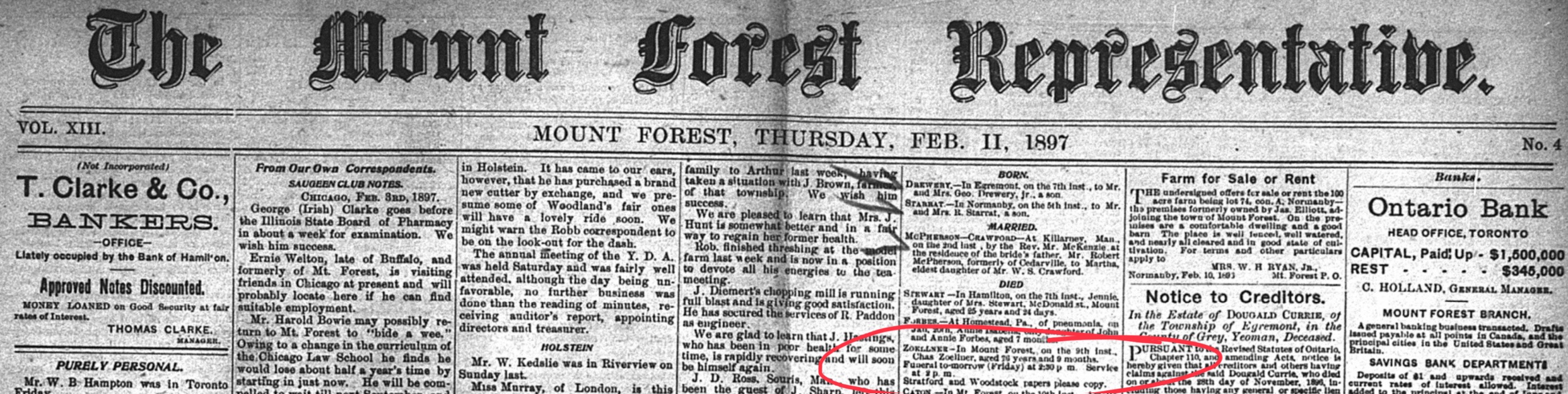 Birthdate1822 May 8Deathdate1897 Feb. 9Buried: Mount Forest Cemetery. Southgate Township, Grey County, Ontario, Canada Clipping from The Mount Forest Representative - February 18, 1897 The Mount Forest Representative - February 11, 1897Attachment