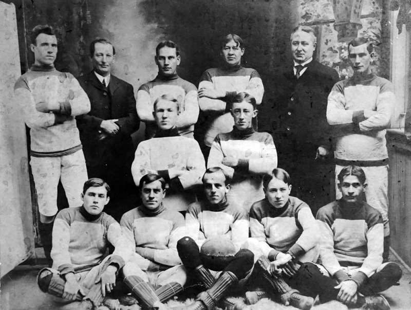 Standing, from the left: S. Ireland, right half back; J. Vance, President; W. Weitzel, back (trainer); C. Mohr, goal; J. Krug, Hon, Pres.; Hy. Weitzel, left half back