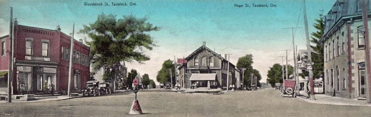 The set of postcards printed in 1923 and published by J. E. Evans of Port Rowan Ontario includes a four postcard panoramic view of the town taken from the water tower, a two postcard view of the centre of town from Hope Street East (this one), a two postcard view of Woodstock Street South looking to the centre of town, and single views of the Carnegie Library (with mortar cannon to the right of the picture) and of workers building the curbs in the centre of town.