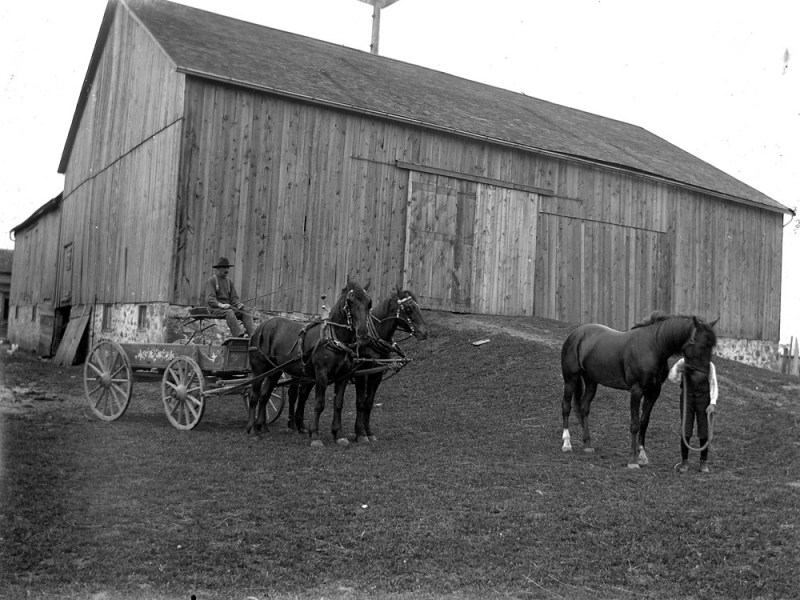 Horses, buggy at barn