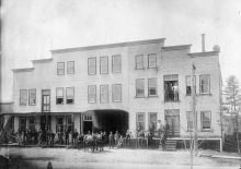 In 1869, brothers-in-law John Kalbfleisch and Adam Schaefer commenced business as contractors and builders, operating a planing mill and furniture factory on the west side of Woodstock Street just north of the railway. In 1899 a new addition facing Woodstock Street was added, 100 ft. long, with a three-storey front. Proudly pictured with his employees, Mr. Kalbfleisch can be seen to the left of the steps with his hands on his lapels.