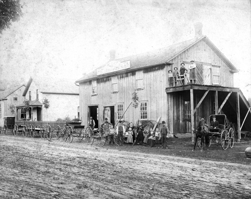 In 1874, William Matthies took over the carriage business of Vipond Sparks, one of Tavistock’s early pioneers, and built this shop at 63 Woodstock Street South on the corner of Woodstock and DeCew streets. It was refitted in 1888 with a new addition built. Standing behind the boy with the wheelbarrow is Caspar Kaufman. The next man holding the wheel is Henry Matthies, and the next is William Matthies.