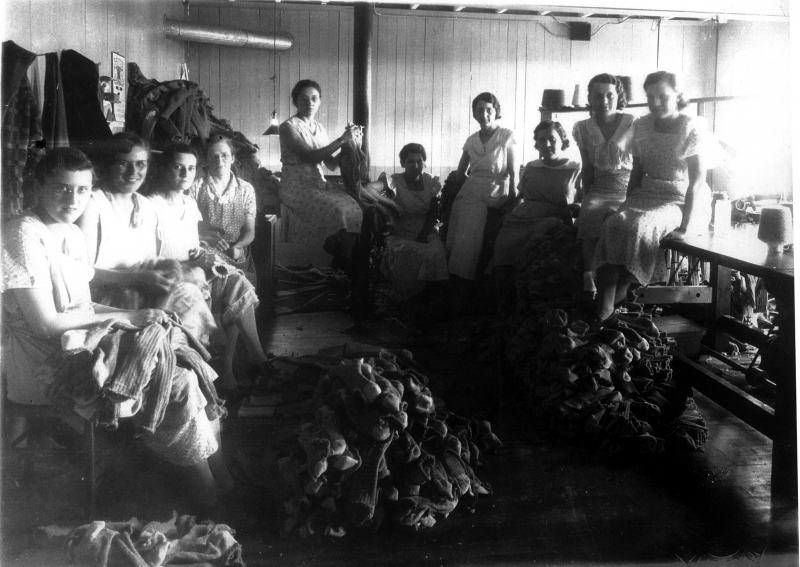 In the looping room of '34, the ladies sewed the toes of the socks shut, mostly by hand. They were then tied in bundles of 24 (two dozen), Shown from left to right are Verna Mae Bender, Hilda Youngblut, Sally Erb, Edna Zehr, Clara Zehr, Margaret Keutsch, Bessie Lebegut; Beulah Keutsch, Edna Neeb and Alberta Schmidt.