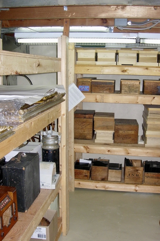 There are three separate basement storage areas. This is the primary one at the front of the building. In this space we store everything from oil paintings to dental equipment to shoe lasts. The newel post from The Maples, when it was a private home, is here. So is a wool carder and Tavistock’s first radio. Many other items in our collection add to the eclectic mix in the front basement. Of prime importance, this is where we store the glass negatives from our Lemp Studio Collection. They are all safely housed in the specially-made wooden boxes seen in this photo.
